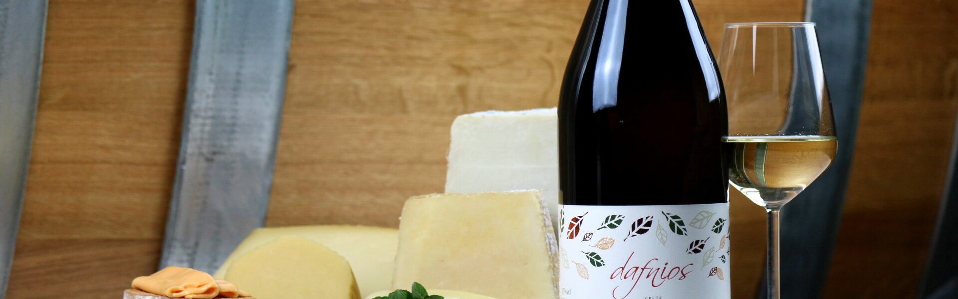 A Vidiano white wine without barrel aging, such as Dafnios White by Douloufakis, pairs wonderfully with Emmental, Regato, and young Graviera. Additionally, a Sauvignon Blanc pairs pleasantly with goat’s cheese.